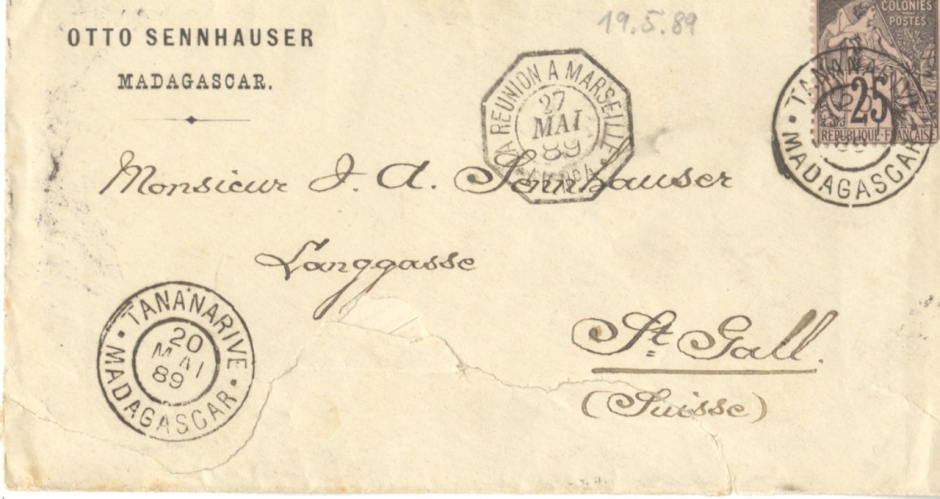 Mit 29 Jahren trat Otto erneut eine Reise an. Sie führte ihn nach Madagaskar, wo er die Textilproduktion vertreiben sollte, aber auch andere Schweizer Firmen mittels Mandate vertrat. Der Verkauf der regelmässigen Warenlieferungen von Sennhauser & Cie. brachten ihm das Geld für seinen Lebensunterhalt ein. Ottos Briefe an seine Eltern und seinen Bruder in St.Gallen sind zahlreich und ein wahrer Fundus verschiedenster Details, seien es Auskünfte über Geschäftsbeziehungen, die zuweilen staunenden Eindrücke von Flora und Fauna oder auch die eurozentristisch geprägte Sicht auf die Madagassen. Die Briefe bieten eine sehr persönliche Sicht auf das Unterfangen, zeigen, womit Otto Sennhauser zu kämpfen hatte, und lassen einiges offen – umso anregender für die Fantasie!