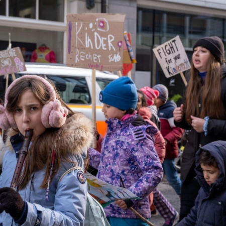 Nach einer kindergerechten Rede von Stadtrat Mathias Gabathuler zog die Kinderrechtsdemo durch die Altstadt. Den Abschluss bildete eine fröhliche Kinderdisco im Talhof.