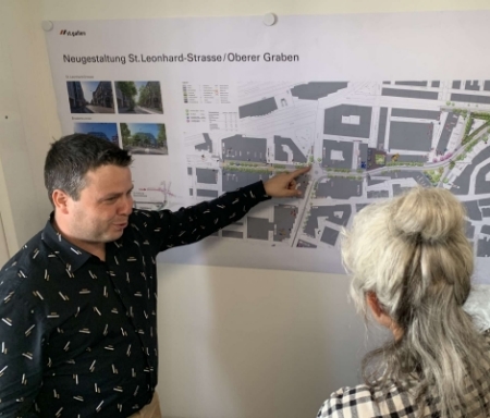 Weniger Tempo und Parkplätze, dafür mehr Grün und mehr Aufenthaltsqualität soll es in fünf Jahren auf der St.Leonhard-Strasse und am Oberen Graben geben. Stefan Pfiffner, Leiter Verkehrsplanung beim Tiefbauamt, gibt Auskunft über das Projekt der Neugestaltung und die jetzt laufende Mitwirkung.