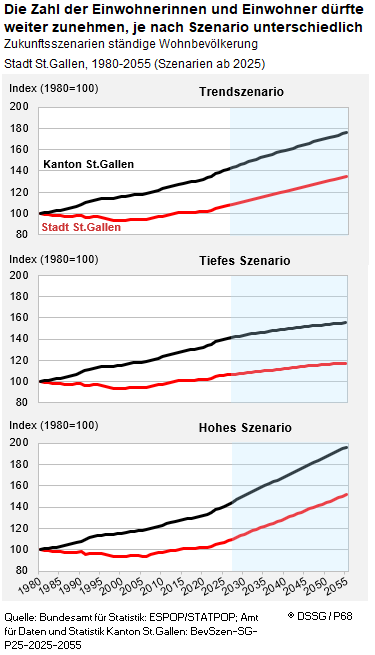 Gemäss kantonalen Bevölkerungsszenarien des Amtes für Daten und Statistik soll sich auch in den Jahren ab 2024 die Bevölkerungszunahme des letzten Jahrzehnts fortsetzen. In allen drei Szenarien folgt die Zunahme der stadtsanktgaller ständigen Wohnbevölkerung in etwa der gesamtkantonalen Entwicklung. Der Unterschied zwischen den drei Szenarien ist allerdings beträchtlich. Im Trendszenario resultiert bis ins Jahr 2055 ein Zuwachs gegenüber 2024 um 21'600 auf 100'500 Einwohnerinnen und Einwohner. Im tiefen Szenario, bei dem von einer niedrigeren Nettozuwanderung und Fruchtbarkeit ausgegangen wird, beträgt der Anstieg noch etwa 9'000 auf 87'800 Personen. Im hohen Szenario führen höhere Nettozuwanderung und Fruchtbarkeit dazu, dass die Stadt St.Gallen mit einem Zuwachs von knapp 34'300 auf 113'200 Personen die Grossstadtgrenze deutlich überschreitet.