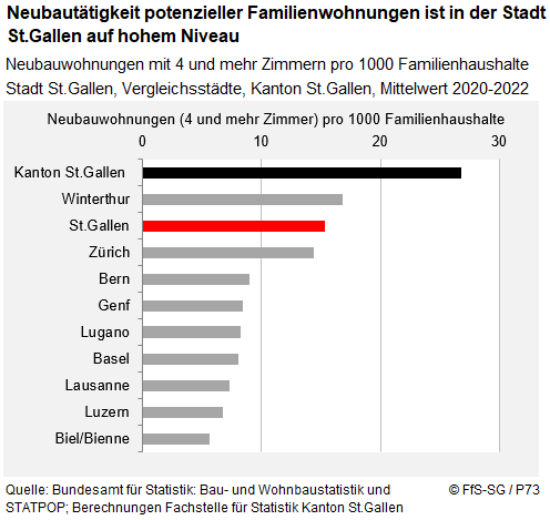 Im Durchschnitt der Jahre 2020 bis 2022 wurden in der Stadt St.Gallen je 1000 in der Stadt wohnhafter Haushalte mit Kindern gut 15 neue potenzielle Familienwohnungen erstellt. Dieser Wert liegt zwar deutlich tiefer als im Kanton, ist im Vergleich der zehn grössten Städte der Schweiz aber auf hohem Niveau. Nur in Winterthur war die Bautätigkeit bei potenziellen Familienwohnungen noch etwas höher. In der Stadt Biel war sie nur ein Drittel so hoch.