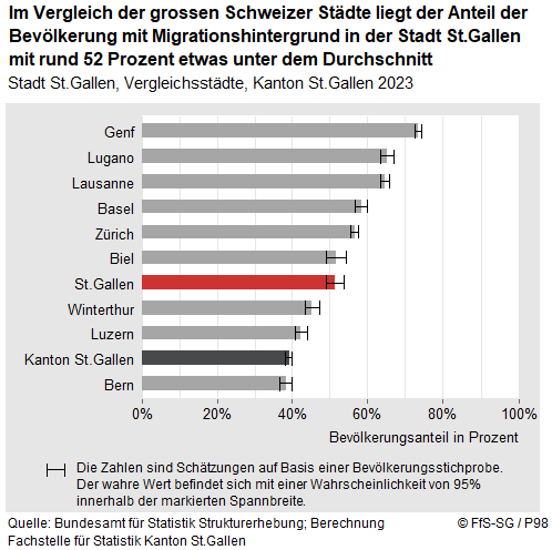 In den Städten der Schweiz ist der Anteil der Bevölkerung mit Migrationshintergrund überdurchschnittlich hoch. Während sich die Stadt St.Gallen im Städtevergleich mit rund 52 Prozent im unteren Mittelfeld bewegt, liegt der Bevölkerungsanteil von Personen mit Migrationshintergrund in der Stadt gegenüber dem Kanton St.Gallen um rund 12 Prozentpunkte höher. Die Gründe für den höheren Anteil an Zugewanderten in den städtischen Gebieten mögen divers sein. Sicherlich spielen aber auch die vielfältigeren Beschäftigungsmöglichkeiten hierfür eine wichtige Rolle (z.B. der Sitz von internationalen Organisationen oder international agierenden Grosskonzerne). Ebenso schafft die Nähe innerhalb städtischer Quartiere günstigere Bedingungen für die Kontakte und Netzwerke innerhalb der jeweiligen Zuwanderergruppen.