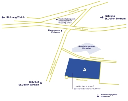 Das Areal «Mövenstrasse» befindet sich im Industriegebiet St.Gallen Winkeln und ist Teil des strategisch bedeutenden Entwicklungsgebiets St.Gallen West – Gossau Ost. Es bietet ausgezeichnete Voraussetzungen für wirtschaftliche Nutzungen, mit attraktiven Rahmenbedingungen, gut erschlossener Infrastruktur und einem hohen Entwicklungspotenzial für Unternehmen unterschiedlichster Branchen.